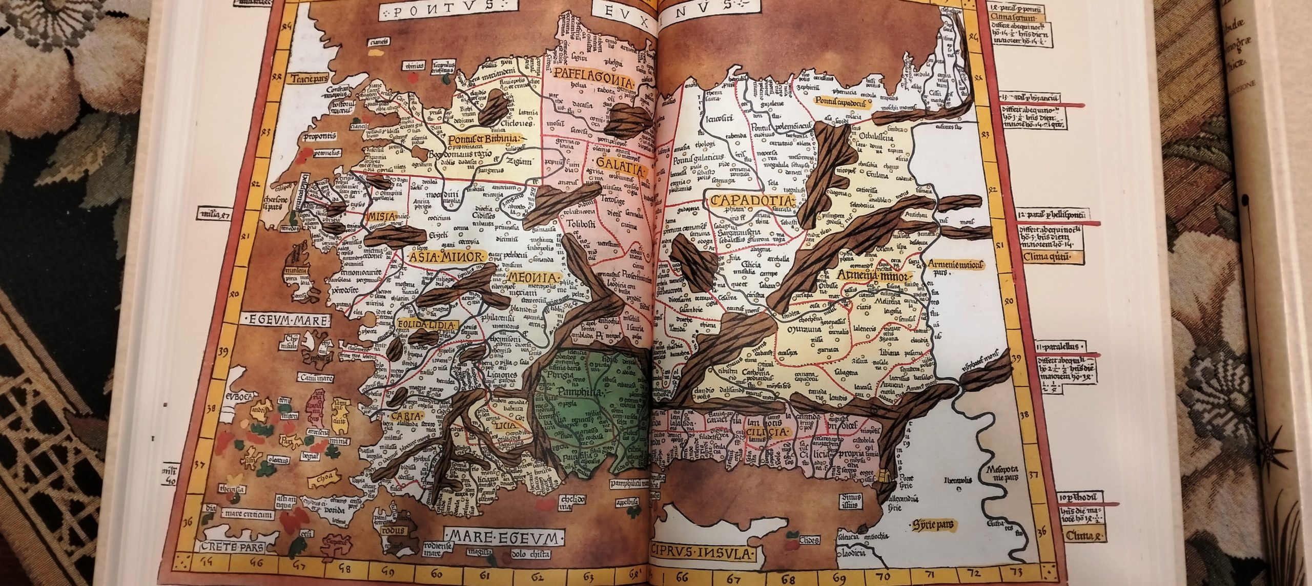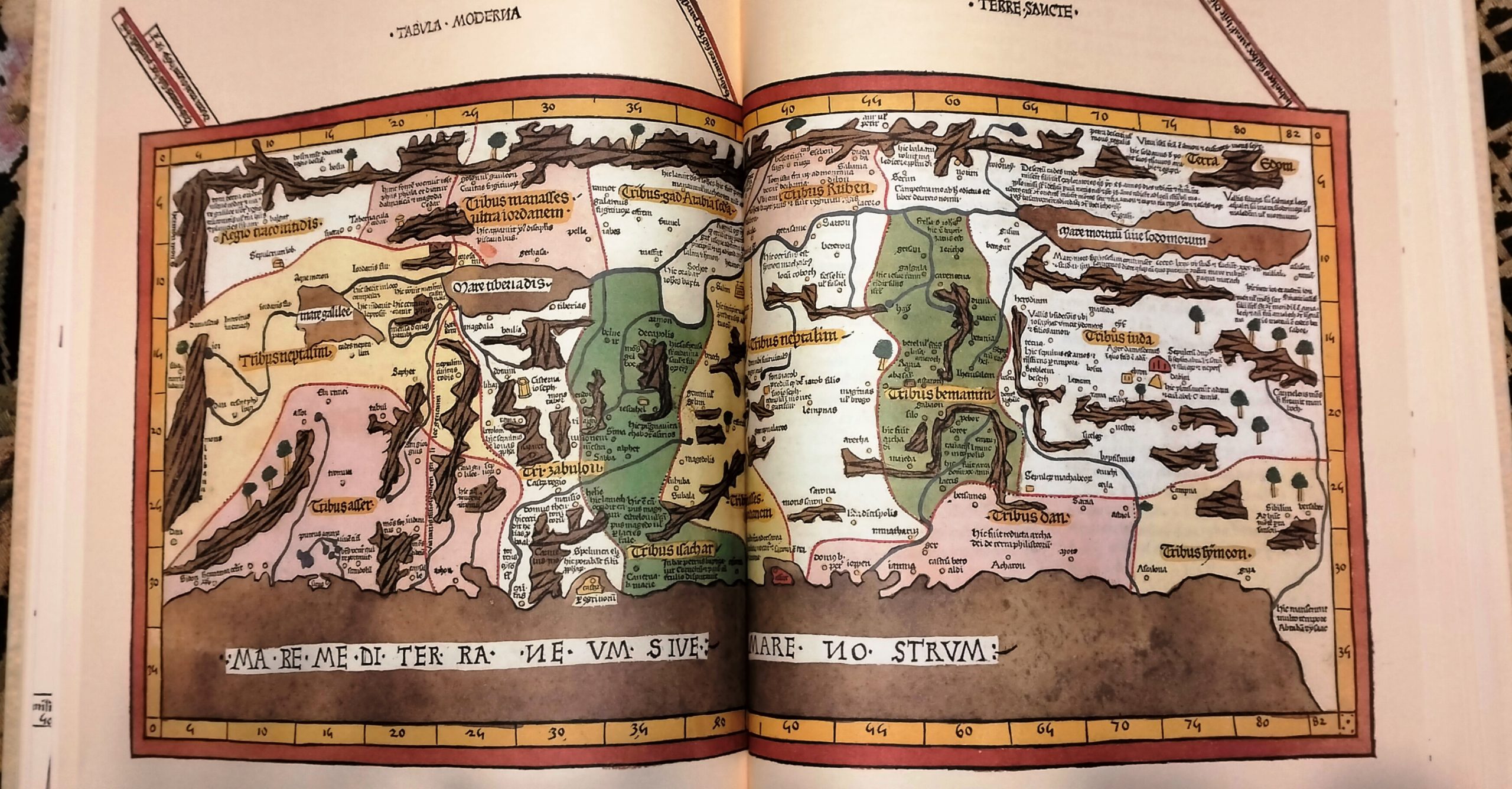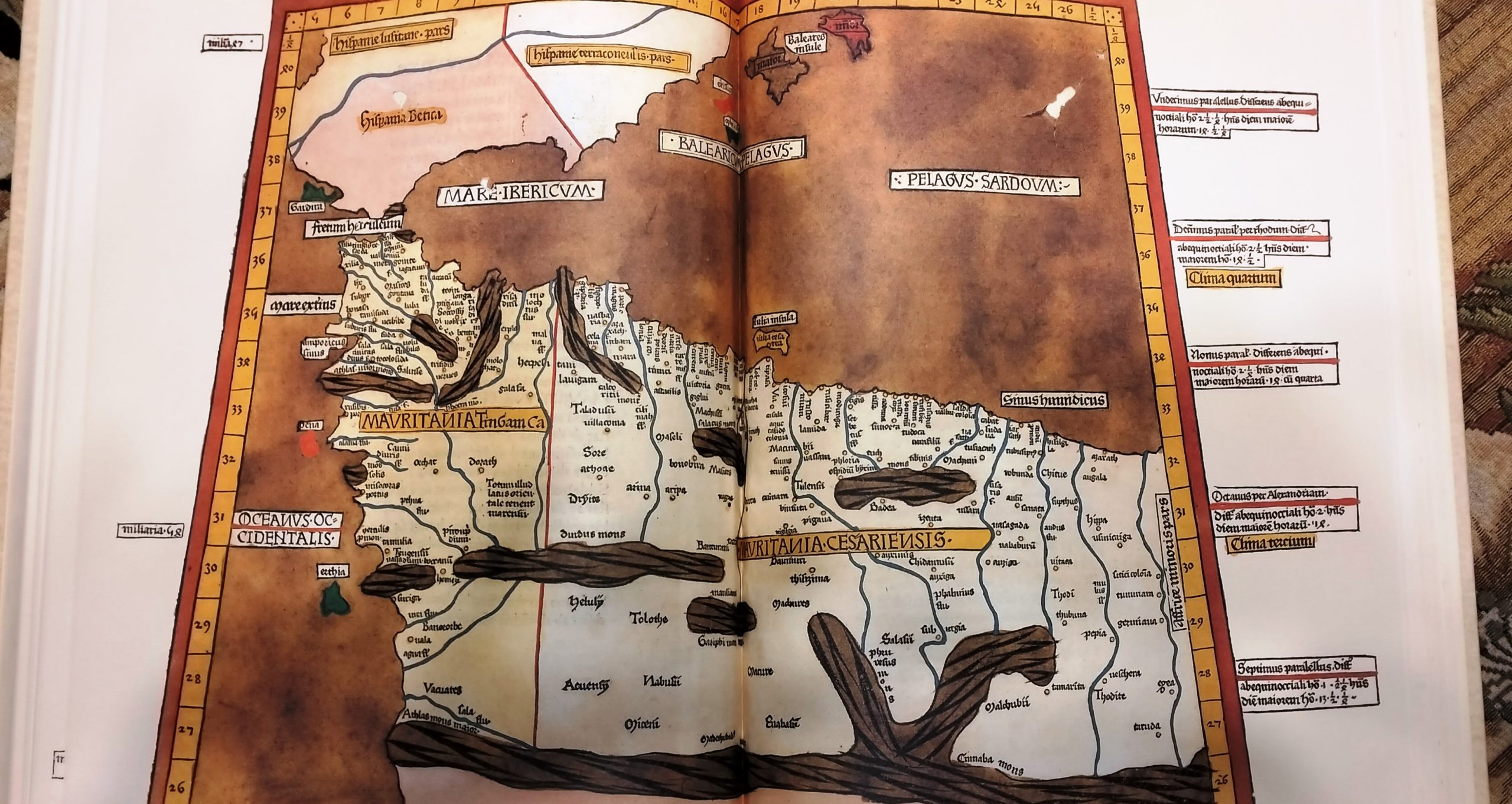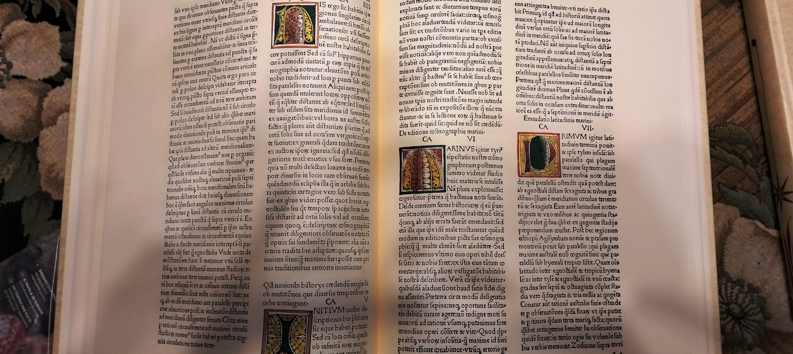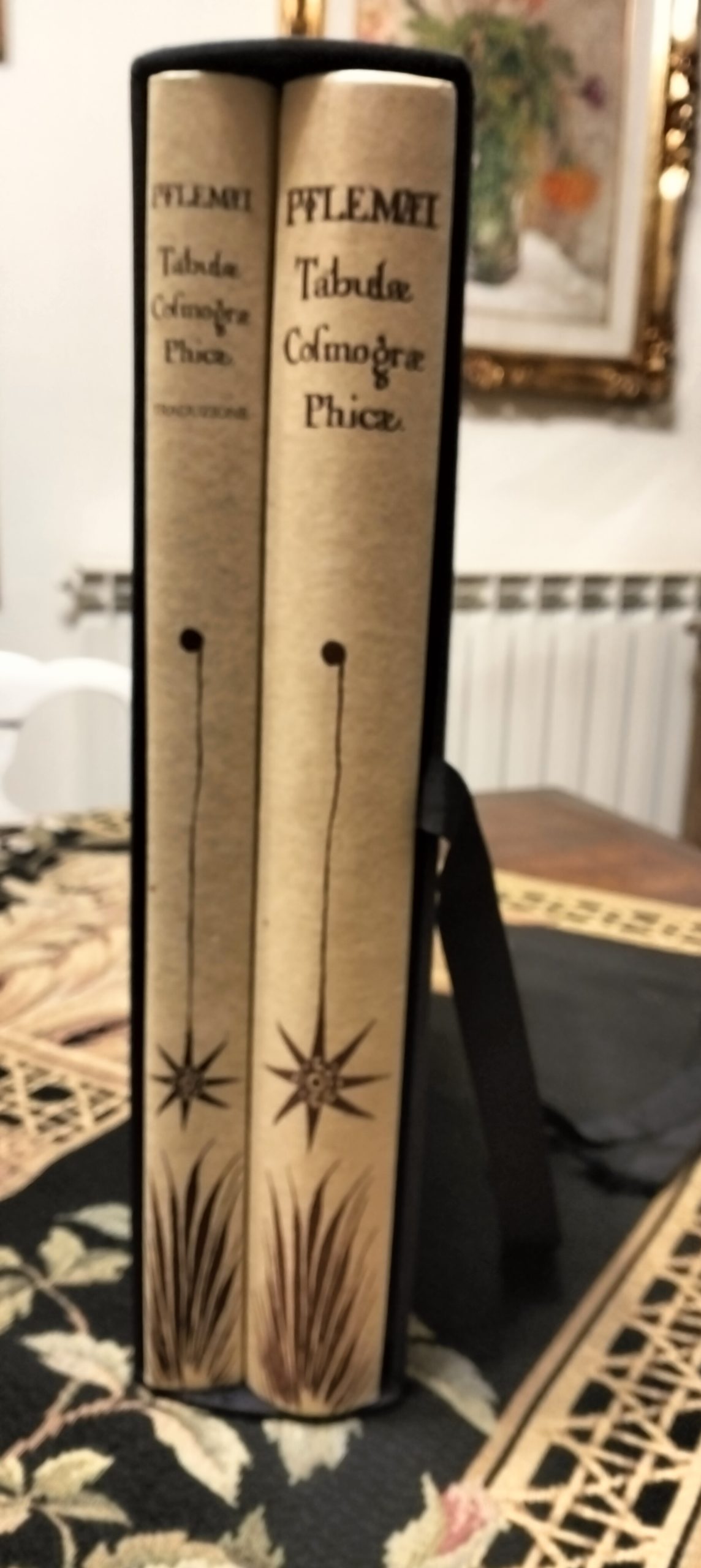 in Folio (cm. 41 x 30) cartonatura edit. similpergamena, tit. ai dorsi, volumi 2 entro cofanetto editoriale in seta nera con titolo e fregi in oro, pp. X-307 (Studio e traduzione. Curatore Sante Bortolani); pp. 400, con numerosi capilettera figurati a colori, figure nel testo e molte belle tavole geografiche a colori fuori testo (Riproduzione in facsimile dell’opera: Ptolomei Tabulae Cosmographicae, stampata da Johannes Reger nel 1486 nella città tedesca di Ulma). Pregiata edizione in tiratura limitata a 2999 copie numerate (ns. copia n. 2372). Ottimo esemplare.